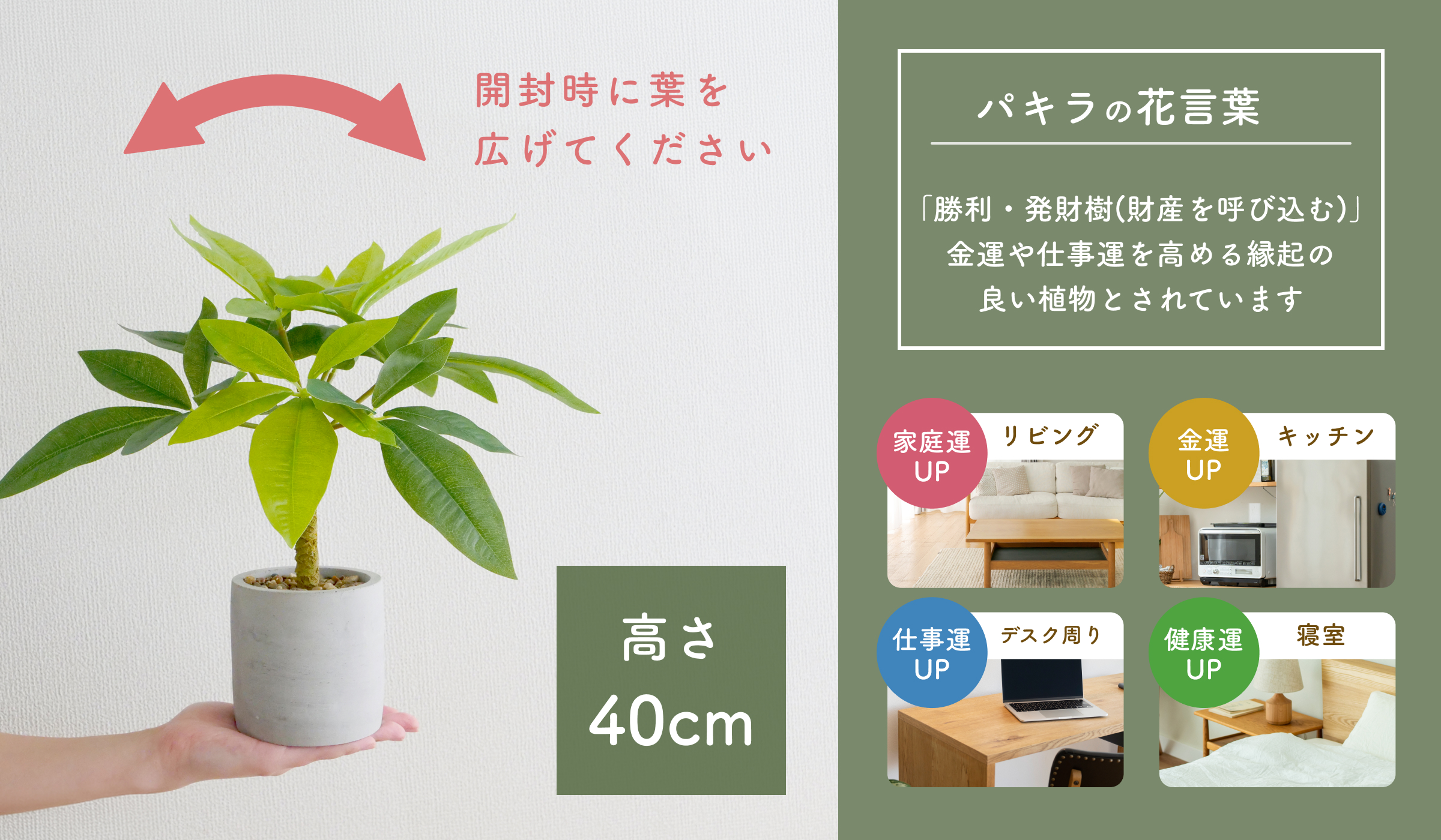 パキラは勝利や財産を呼び込むと呼ばれており、金運や仕事運を高める縁起の良い植物とされています。